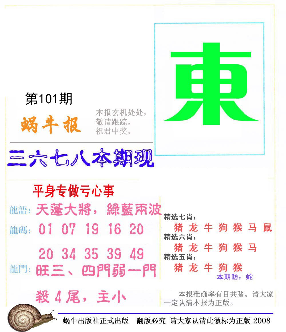100期必杀一头〔杀0 2 4头〕开:蛇38 |